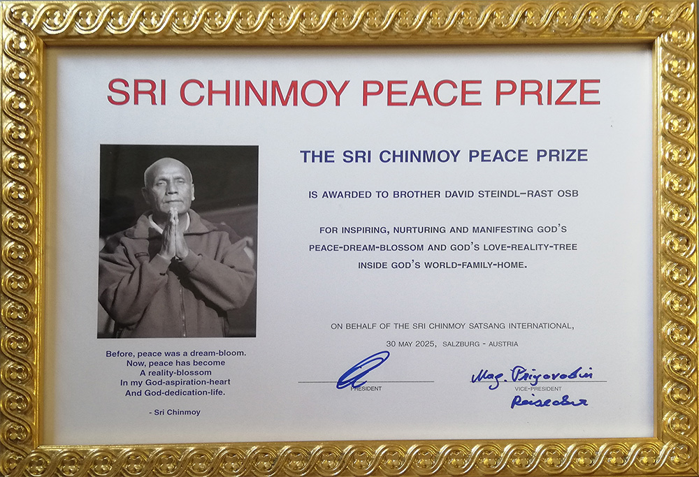 In der Begründung zur Preisverleihung durch den internationalen Verein Sri Chinmoy Satsang heißt es: «David Steindl-Rast erhält den SRI CHINMOY PEACE PRIZE für seine Bemühungen, die stets daran erinnern, dass Frieden im Herzen eines jeden Einzelnen beginnt. Zudem geht die Auszeichnung an ihn, da er immer darum bemüht war und ist, Frieden zwischen Menschen verschiedenster Religionen, spirituellen Bewegungen und Ländern zu schaffen und das herauszuarbeiten, was alle verbindet.»